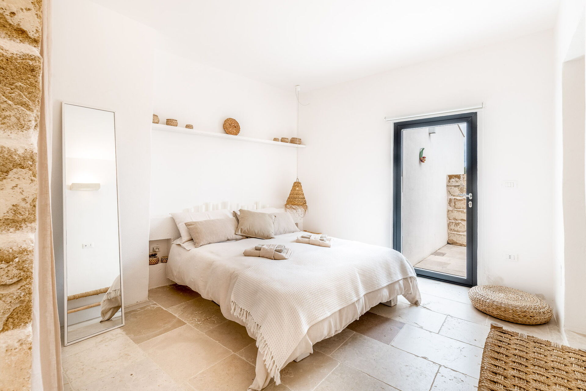 Upon entering the main building, guests will find a large living room with comfortable sofas, a fireplace, and a TV. Accessible from the living room, the well-appointed kitchen serves as the connection to the sleeping quarters. The three double bedrooms are elegantly furnished with a simple and stylish design, boasting features such as exposed stone walls, wooden accents, open wardrobes, double beds, bedside tables, and reading lights. Two of the bedrooms come with en-suite bathrooms, while the third shares a bathroom with the living area. The bathrooms are equipped with all the necessities including a toilet, bidet, sink, mirror, and a shower.