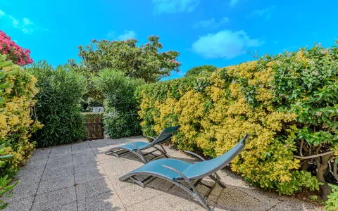 2-værelse-lejlighed 35 m2, på forhøjet stueetage. Meget pæn indrettet: indgang med 1 x 2 køjesenge (70 cm, længde 190 cm). Stue/spisestue med TV (fladskærms TV). 1 værelse med 1 fransk seng (140 cm, længde 190 cm). Udgang til terrasse. Åbent køkken (ovn, opvaskemaskine, 3 keramiske kogeplader, Brødrister, kedel, mikroovn, elektrisk kaffemaskine). Brus, særskilt toilet. Klimaanlæg. Lille terrasse 9 m2, nord vendt, lille havesiddeplads 23 m2, syd vendt. Havemøbler, liggestole (2). Til benyttelse: vaskemaskine. Internet (trådløs LAN [WLAN], gratis). Parkeringsplads nr. 46. Bemærk venligst: maksimum 1 husdyr/hund tilladt. Brandalarm. Offer by a private individual according to Art. 155, IV of CGI. S00003266547