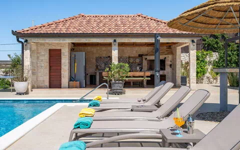 Zemunik Donji 22 km fra Zadar: Smuk enfamiliehus "Villa Tanja". 17 km fra centrum af Sukošan, solrige beliggenhed, 17 km fra havet. Til alene benyttelse: grund 1'500 m2 (indhegnet), pool (8 x 4 m, 140 cm dyb, Sæsonbestemt tilgængelighed: 01.Maj. - 01.Okt.) med indetrappe. Udendørs brus. I huset: adgang til internet, vaskemaskine. Parkeringsplads (for 2 biler) ved huset på grunden. E-ladestation. Indkøbsforretning 1 km, restaurant 17 km, busstoppested 7.1 km, kiselstenstrand 17 km. Nærliggende attraktioner: NP Krka 67 km, NP Paklenica 39 km, Fun park Biograd 32 km. Kendte søer nås nemt: Vrana See 33 km. Unge grupper kun på forespørgsel. Bemærk venligst: flyveplads 12 km fra huset.