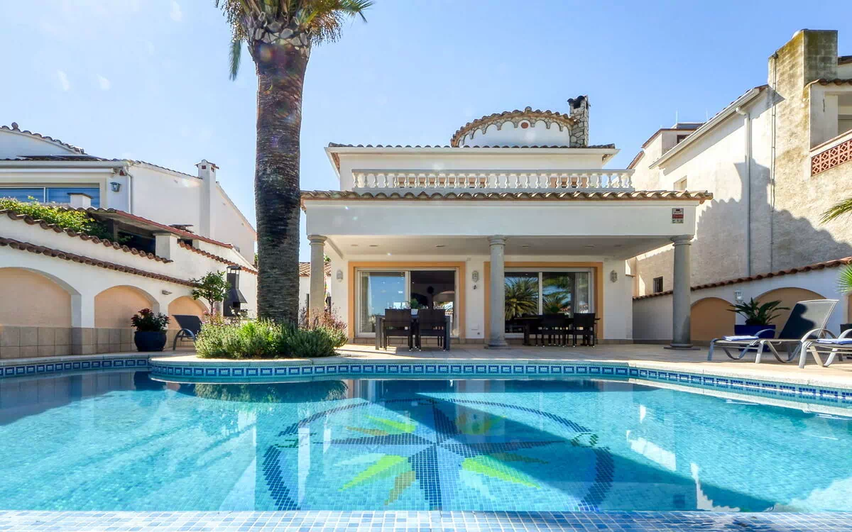 5-værelse-hus 130 m2 på 2 etager. Rummelig og lys, komfortabelt og smagfuld indrettet: stue/spisestue med sat-TV og digital TV (fladskærms TV). Udgang til have, til pool. 1 værelse med 1 fransk seng (160 cm). Åbent køkken (4 kogeplader, ovn, opvaskemaskine, mikroovn, fryser) med bar. Brus/WC. Klimaanlæg, varmluftsopvarming. Overetage: 2 værelse, alle værelser med 1 dobbeltseng (2 x 80 cm), sat-TV. Udgang til altan. 1 værelse med 1 fransk seng (160 cm), brus/WC og sat-TV. Udgang til terrasse. Brus/WC. Klimaanlæg, varmluftsopvarming. Altan, terrasse, havesiddeplads, lysthus. Havemøbler, liggestole, loggia. Flotte udsigt over svimmingpoolen og kanalen. Til benyttelse: vaskemaskine, tørretumbler. Internet (trådløs LAN [WLAN], gratis). Parkeringsplads (indhegnet) ved huset. Bemærk venligst: privat bådplads. TV kun ES, FR. HUTG006239 ESFCTU000017020000140599000000000000000000HUTG0062394