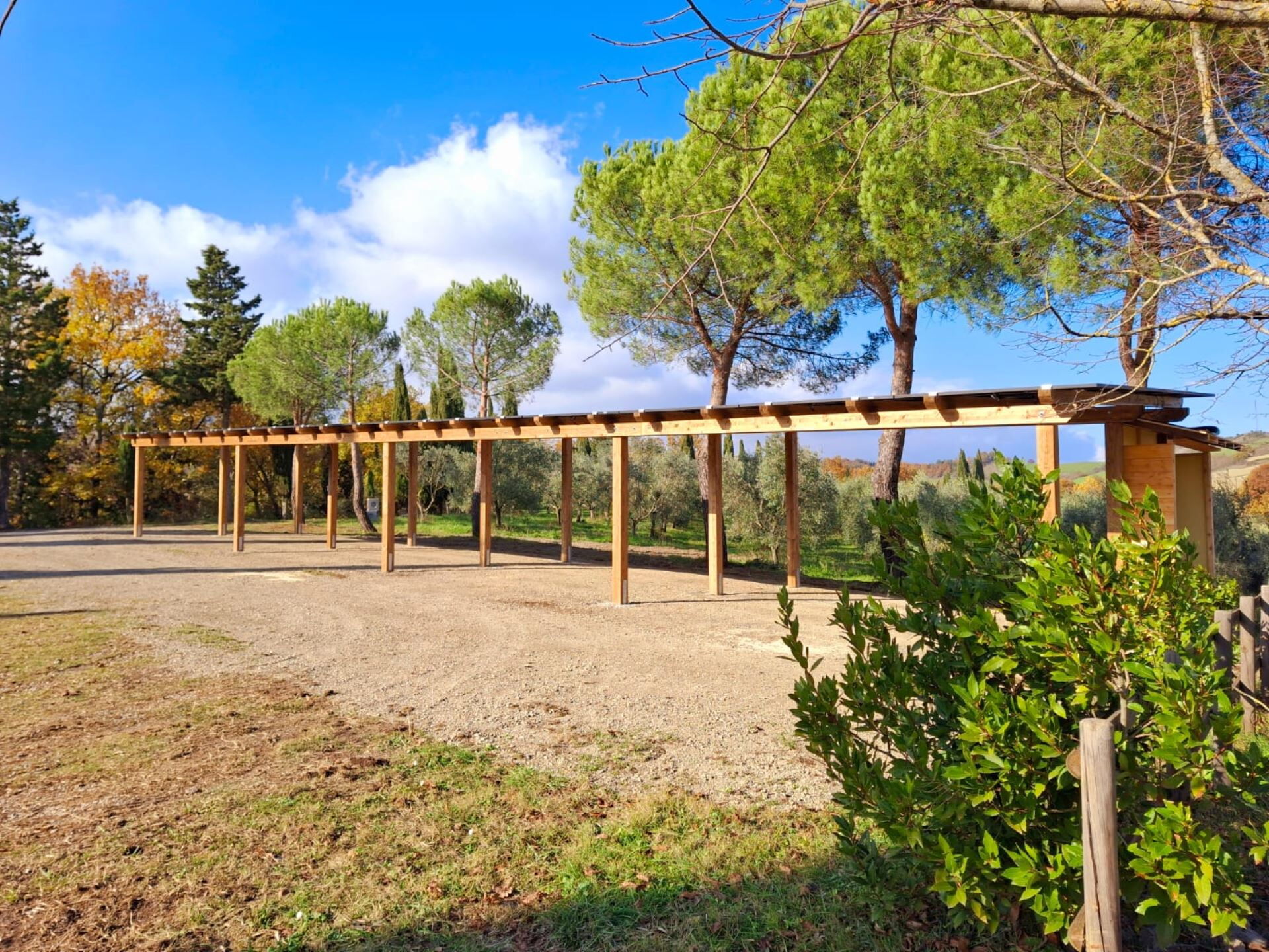 Den historiske park omgiver villaen med modne steneg og høje cypresser, der skaber et roligt naturligt miljø på de omfattende grunde. En smuk infinity-pool på 6x12m giver forfriskende hvile i de varme måneder med drift fra 1. maj til 31. oktober. Ved siden af poolen finder De et boblebad til afslapning, mens De nyder udsigten over dalen. Den halvcirkelformede terracotta-solterrasse strækker sig fra stueetagens opholdsstuer og tilbyder direkte udendørs adgang og solbeskinnede fritidsområder. En overdækket pavillon beskytter grillområdet og skaber et indbydende sted til udendørs spisning og underholdning. Grundene omfatter et udendørs legeområde til rekreative aktiviteter og en volleyballbane til venlige kampe. Et nyt LED-belysningssystem oplyser haven og stierne og skaber fortryllende aftenambiente gennem hele ejendommen. To ladestationer til elektriske køretøjer er blevet installeret for at imødekomme moderne transportbehov. Den omfattende park giver rigelig plads til gåture, udendørs sammenkomster og til at værdsætte det rolige landskab.