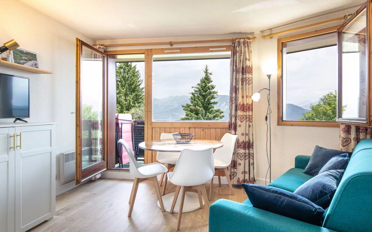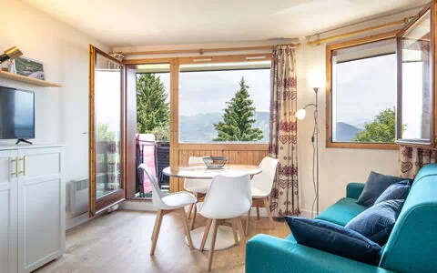 "T. DU Morel A", 2-værelse-lejlighed 27 m2 i 2. etage. Emner egnet for 5 voksne + 1 barn. 1 værelse med 1 dobbeltseng og TV. Stue med 1 sovesofa og 1 x 2 køjesenge, 1 udtræksseng. Åbent køkken (4 kogeplader, ovn, opvaskemaskine, Brødrister, kedel, mikroovn, elektrisk kaffemaskine). Bad/WC. Altan. Udsigt over bjergene. Til benyttelse: hårtørrer. Bemærk venligst: ikke-ryger lejlighed. Brandalarm. Offer by a commercial proprietor according to Art. 155, IV, CGI