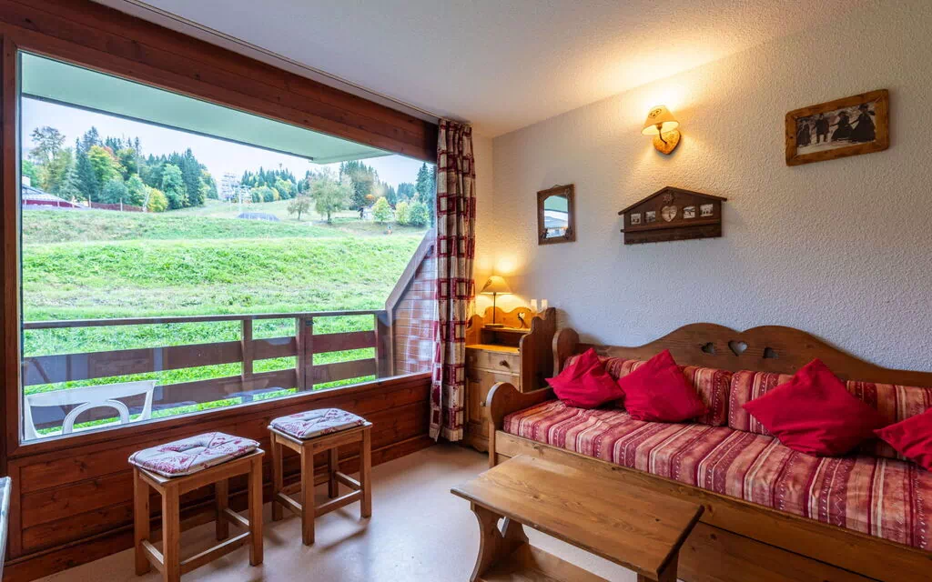 Morillon: Flerfamiliehus. 50 m fra skiområdet. Til medbenyttelse: pool med varme. I huset: elevator. Supermarked 50 m, restaurant 100 m.