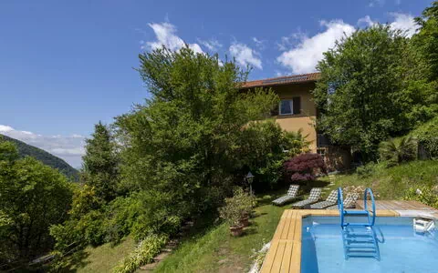 Stor villa "Il Castagneto", 700 meter over havets overflade, på 3 etager, fritstående, omgivet af træer og græsmarker. I lille byen Cortelghe, 7 km fra bymidten af Pisogne, isoleret, rolig beliggenhed ved bakke, direkt ved skovbryn, 8 km fra søen, retning syd. Til alene benyttelse: grund 5'000 m2, stor have i forskellige niveauer (ikke hegnet ind) med blomster og træer, liggeplæne, pool (oppsted svømmebassin) (5 x 3 m, 120 - 120 cm dyb, Sæsonbestemt tilgængelighed: 01.Maj. - 30.Sep.). Udendørs brus, terrasse, havemøbler, grill, legeplads, Underholdning af poolen af ejeren/gartneren. I huset: cykelrum, solterrasse, centralvarme. 200 m lang, stejl, smal tilkørsel (natursti). Parkeringsplads ved huset. Supermarked 7 km, restaurant 7 km, bar 7 km, busstoppested 1 km, banegård "Pisogne" 9 km, varmtvandsbad "Boario Terme" 22 km. Nærliggende attraktioner: Lovere 14 km, Iseo 23 km, Sarnico 39 km, Franciacorta (DOCG wine region) 42 km, Brescia 51 km, Bergamo 59 km. Bemærk venligst: bil anbefales.