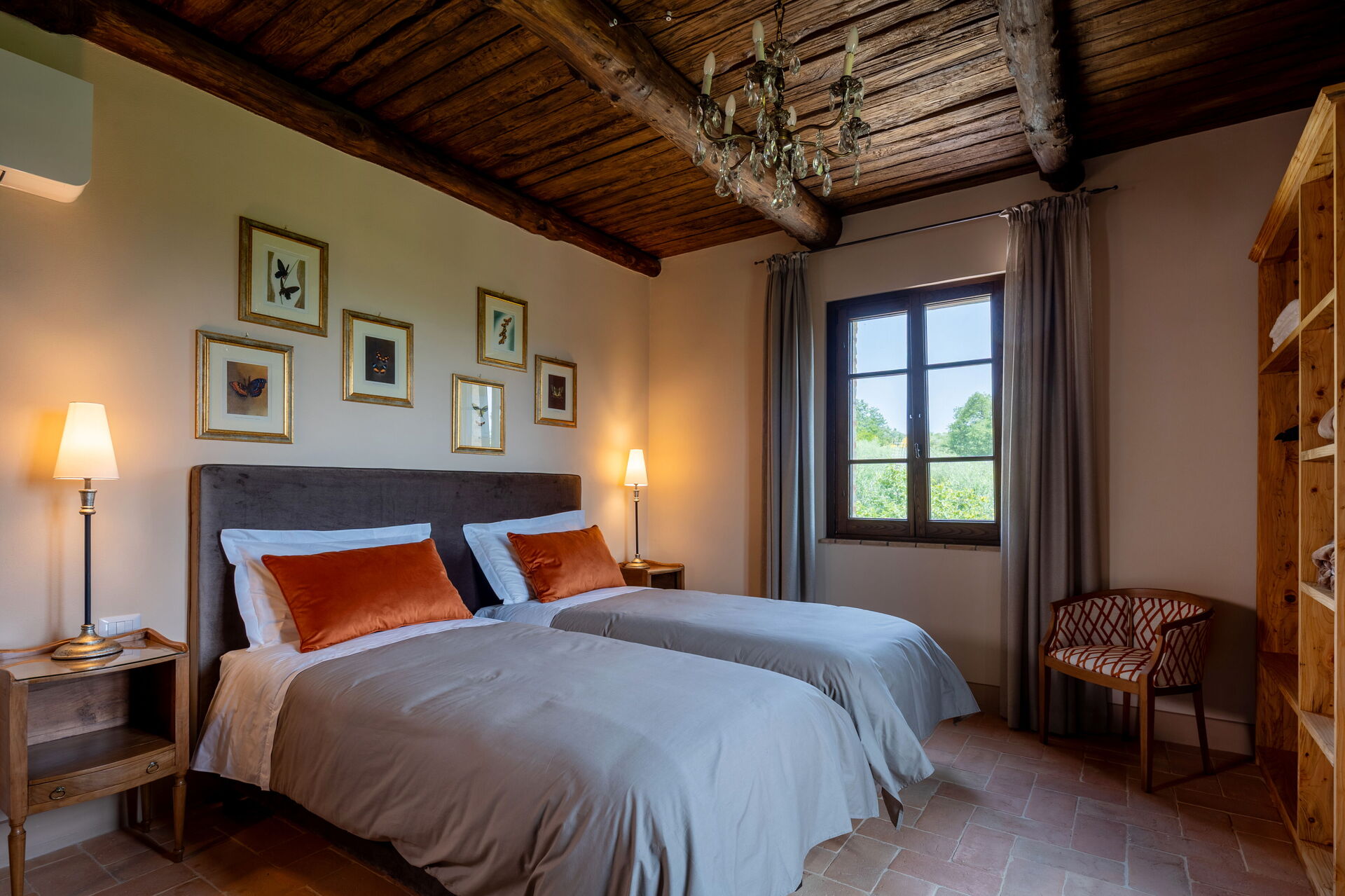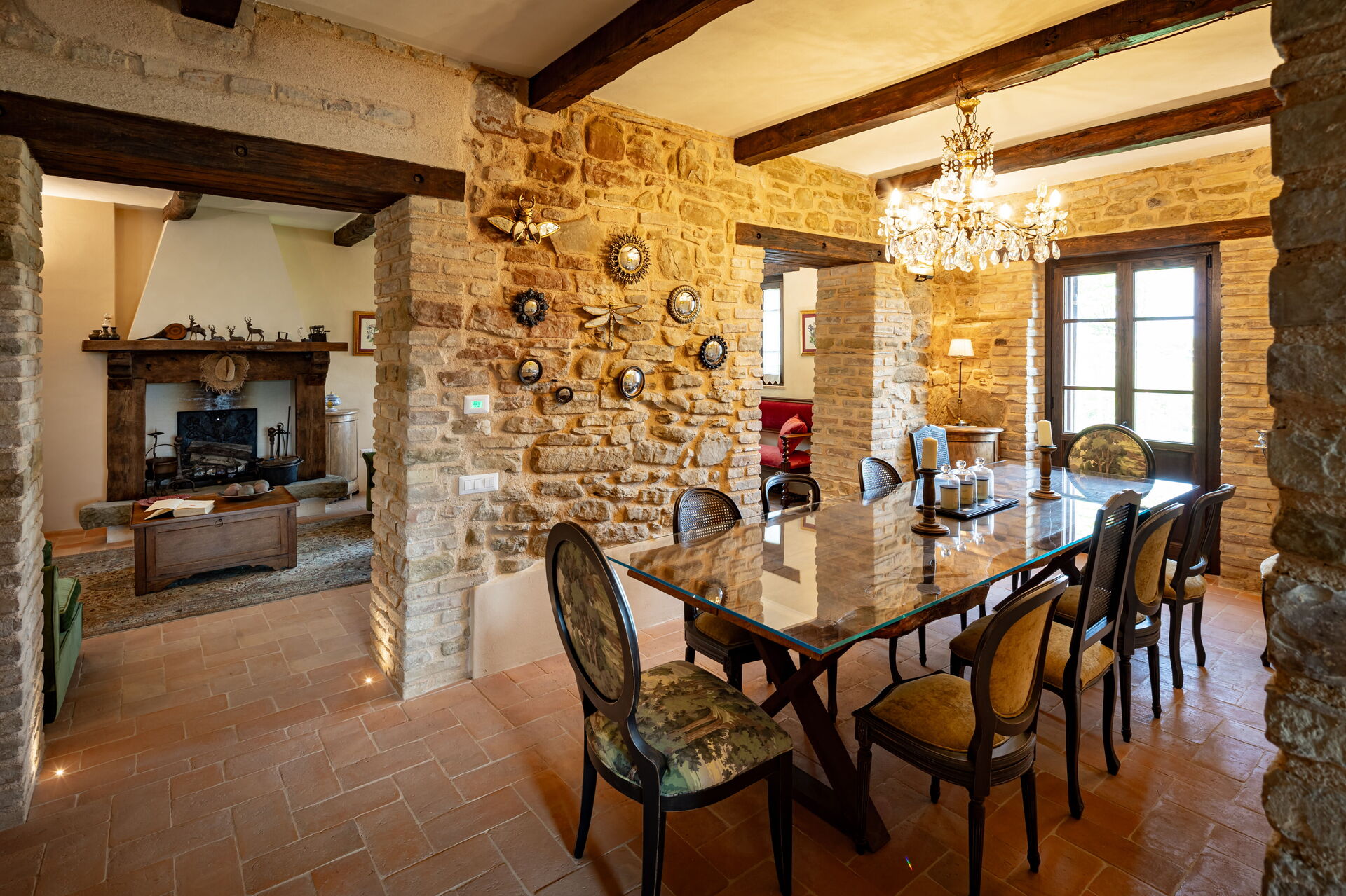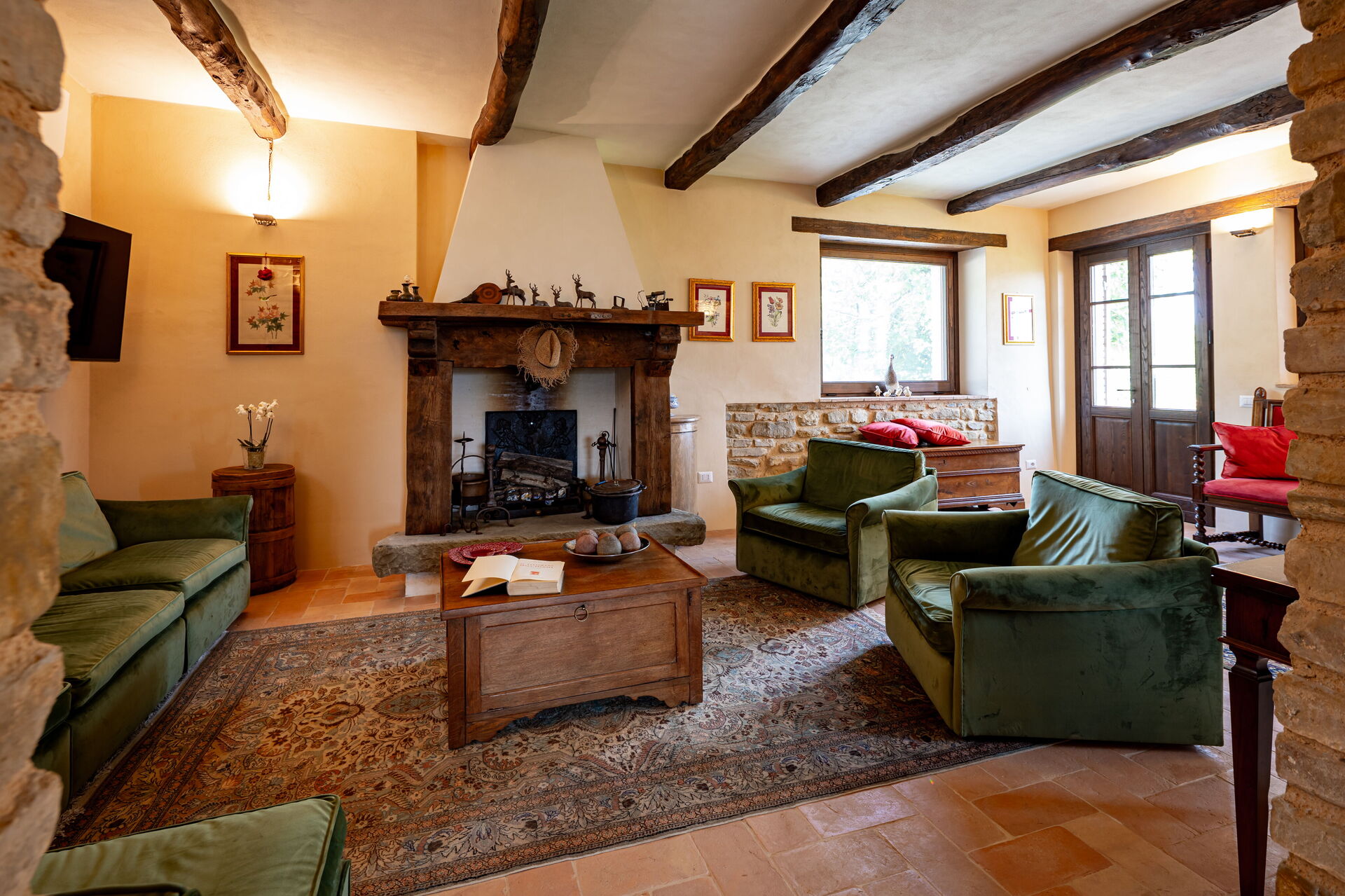 Stue: to sofaer (personer: 7), to lænestole, kamin, WIFI internet, klimaanlæg, tv, myggenet, udgang til have.