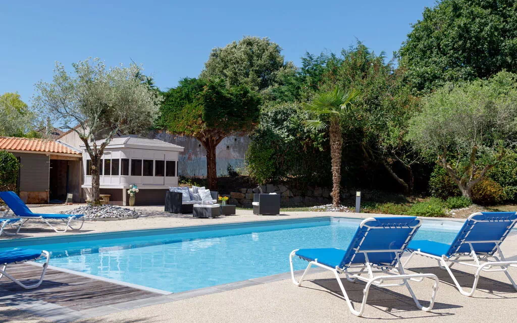 Stor, smuk villa "Le Grand Large". Ejendom bestående af hovedhus og udhus, i bydelen La Fontaine aux Bretons, rolig, solrige beliggenhed, 900 m fra havet, 900 m fra stranden, i en blind vej, retning syd. Til alene benyttelse: grund 3'500 m2 (indhegnet), velplejet have med græsplane og træer, pool med varme (6 x 11 m, 120 - 180 cm dyb, Sæsonbestemt tilgængelighed: 15.Jun. - 15.Sep.) med udvendige jalousier/ skodder. Havemøbler, grill, parkeringsplads på grunden. Indkøbsforretning 2 km, fødevarebutik 2 km, supermarked 2 km, restaurant 2 km, bageri 2 km, 40 minut promenad til center, busstoppested "La Fontaine aux Bretons" 300 m, banegård "Pornic" 3 km, sandstrand "La Fontaine aux Bretons" 900 m (lille), varmtvandsbad "Alliance Pornic Thalasso & Spa" 2 km. Lystbådhavn 3 km, golfbane (18 hul) 7 km, minigolf 7 km. Nærliggende attraktioner: Pornic Aventure Accrobranche 5 km, Legendia Parc 20 km, Planète Sauvage 28 km, La Baule 46 km, Nantes 48 km, Ile de Noirmoutier 55 km. Kendte søer nås nemt: Lac de Saint Viaud 21 km. Vandrestier Sentier des Douaniers 900 m.