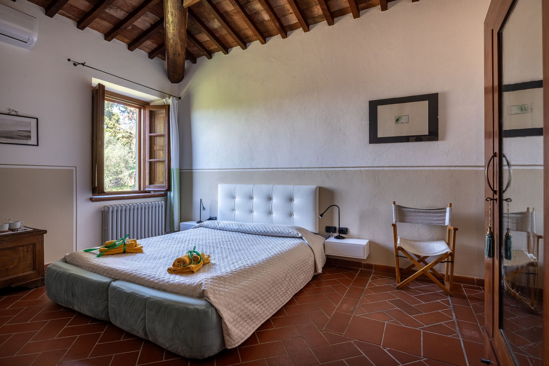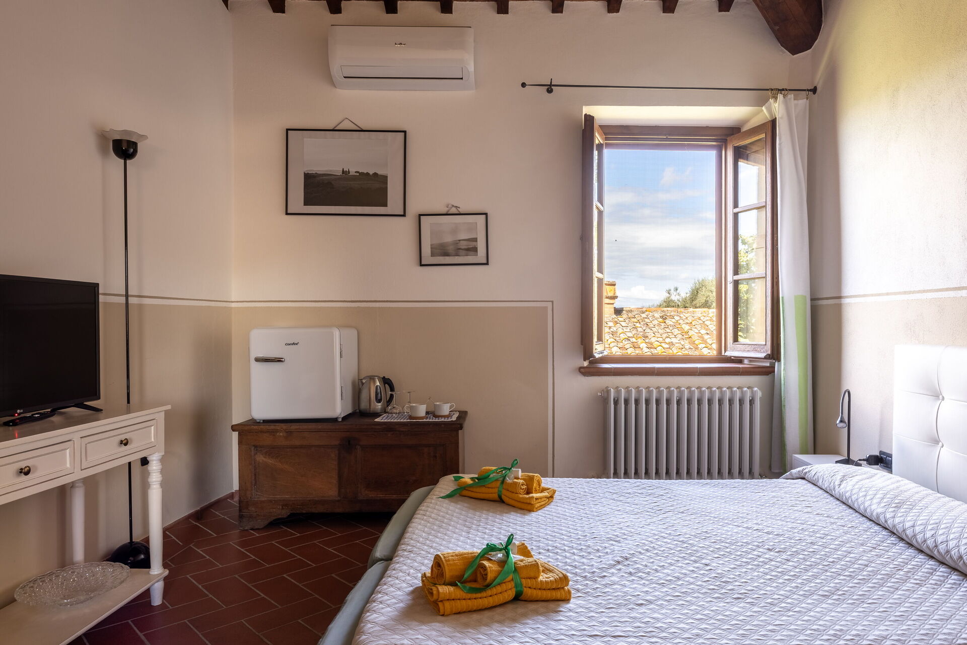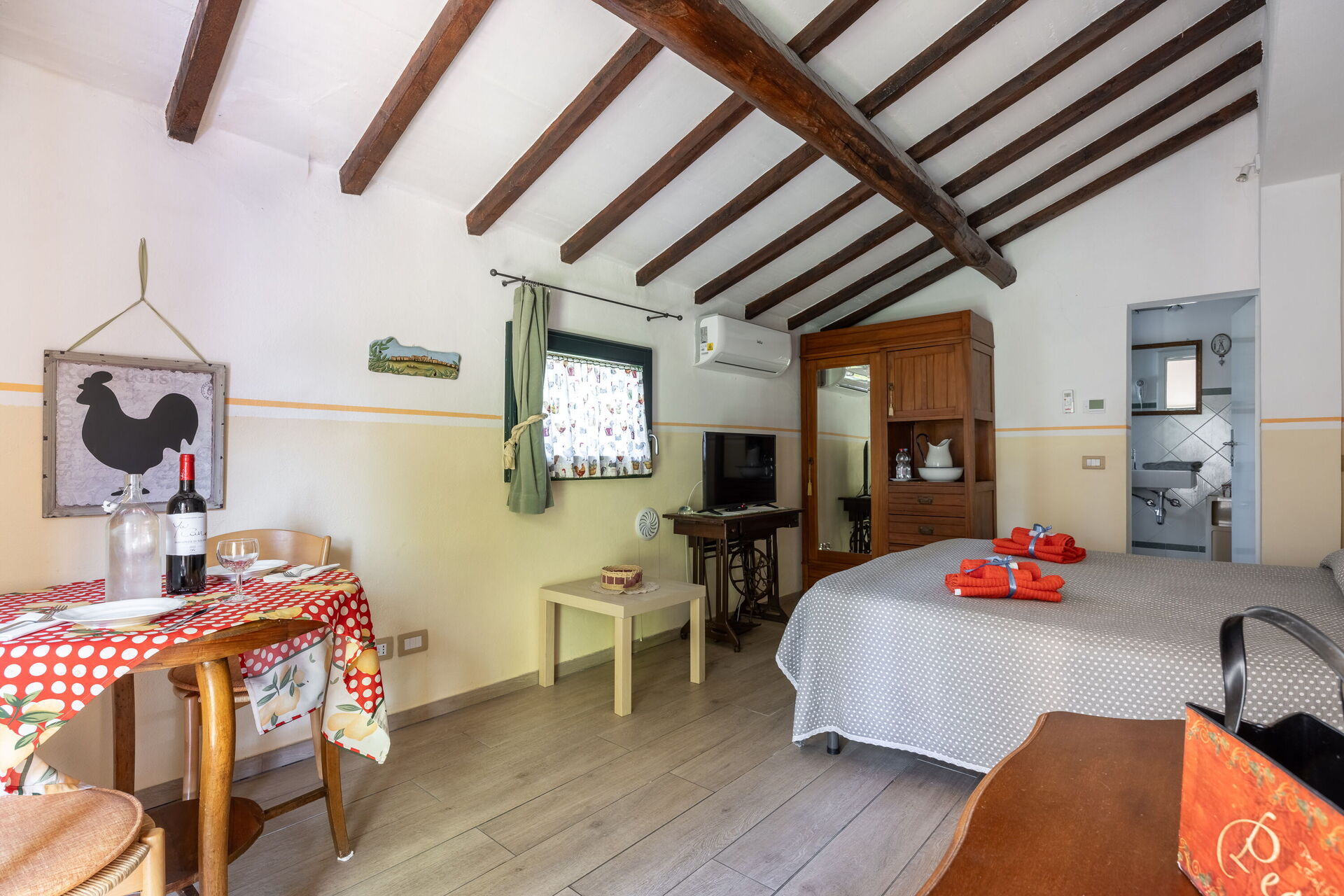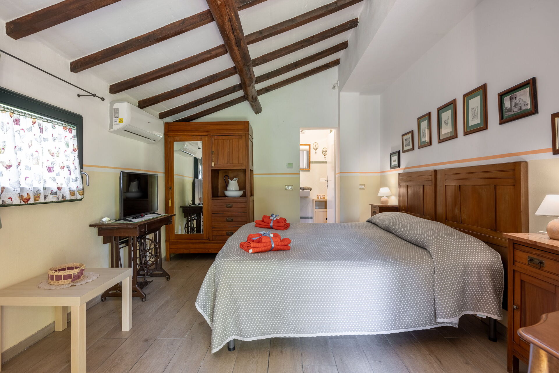 Soveværelse med bad 1: dobbeltseng, WIFI internet, klimaanlæg, tv, køleskab, vask, wc, bidet, bruser, hårtørrer.