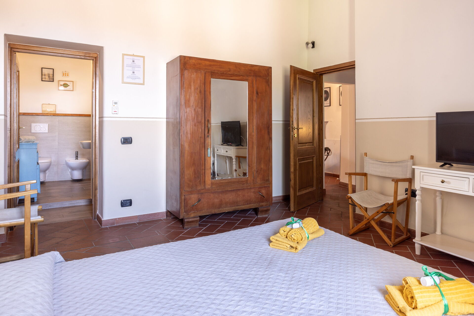 Soveværelse med bad 2: dobbeltseng, WIFI internet, klimaanlæg, tv, køleskab, vask, wc, bidet, bruser, hårtørrer.