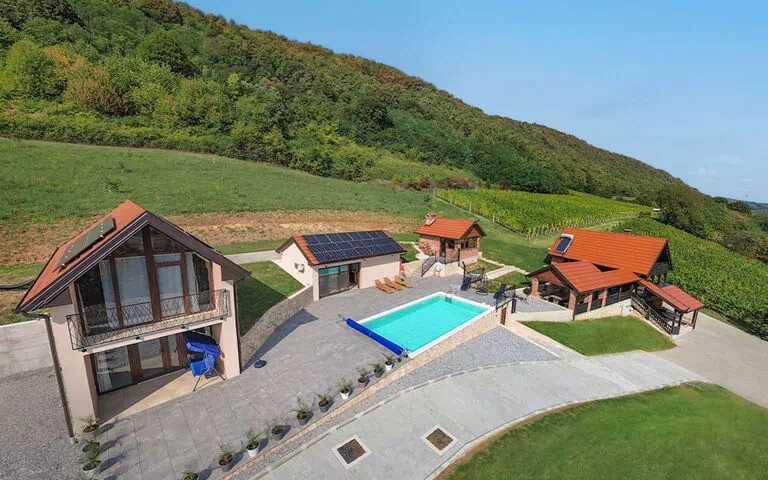 Kalnik 16 km fra Križevci: Hyggeligt, rustikt enfamiliehus "Vila Breg", på 3 etager. 42 km fra bymidten af Varaždin, 69 km fra centrum af Zagreb, ved bakke. Til alene benyttelse: grund 5'000 m2 med græsplane 1'000 m2 træer, pool kantet, med varme (8 x 4 m, 145 cm dyb, Sæsonbestemt tilgængelighed: 15.Apr. - 14.Okt.) med havvand, indetrappe og salt-elektrolys. Brus/toilet i poolområdet, udendørs brus, boblebad, bordtennis, terrasse (20 m2), havemøbler, legeplads (rutschebane, gynge), Underholdning af poolen af ejeren/gartneren. I anlægget: adgang til internet, sauna, bordfodbold. Stejl tilkørsel til til huset (100 m natursti). Parkeringsplads (for 4 biler) ved huset på grunden. Indkøbsforretning 2.5 km, restaurant 3.5 km, café 2.7 km, cykeludlejning 3.3 km, busstoppested 1 km. Vandrestier fra huset 50 m. Nærliggende attraktioner: Old town Veliki Kalnik 3.6 km, Varaždinske toplice 33 km. Unge grupper kun på forespørgsel.