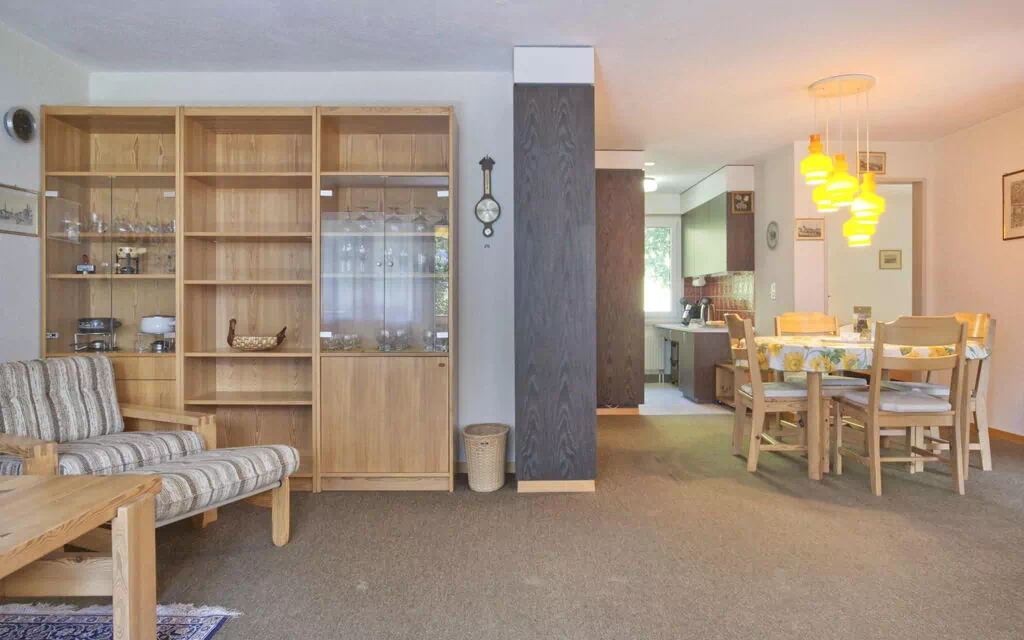 The simply furnished 4.5-room flat on the 2nd floor offers two bedrooms with two single beds and one bedroom with bunk beds as well as a bathroom with bath/WC on 70m2. The holiday flat is equipped with a closed kitchen and a cosy living and dining area. On the balcony you can enjoy the view of the marvellous mountain panorama.