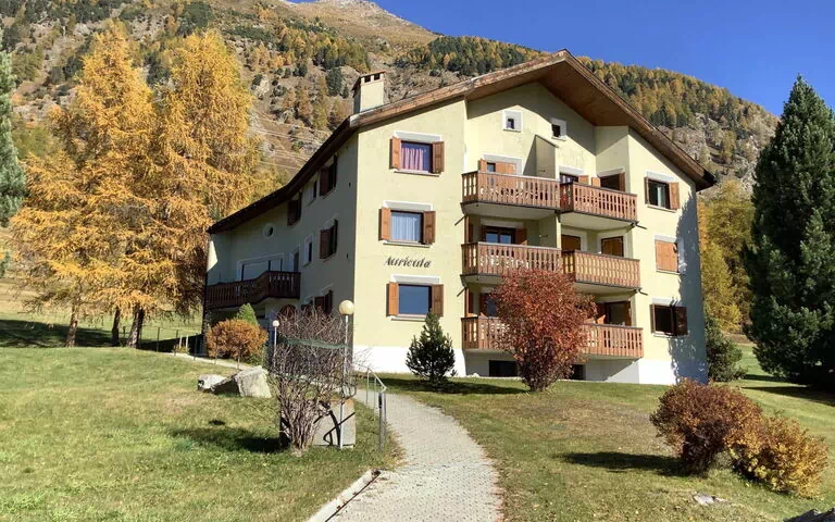 The holiday flat Auricula No. 8 with 2 rooms is located on the first floor of the Chesa Auricula, at Via d'Arövens 18 in Pontresina (quiet street without through traffic) in the natural neighbourhood of Muragls, with a magnificent view of the mountain panorama. The 60 m2 flat is very bright and has modern furnishings with a large flat-screen TV and its own WLAN. It offers a bright bedroom, a living room with views in two directions, a bathroom and a closed kitchen with a small dining table and far-reaching views of the mountains.