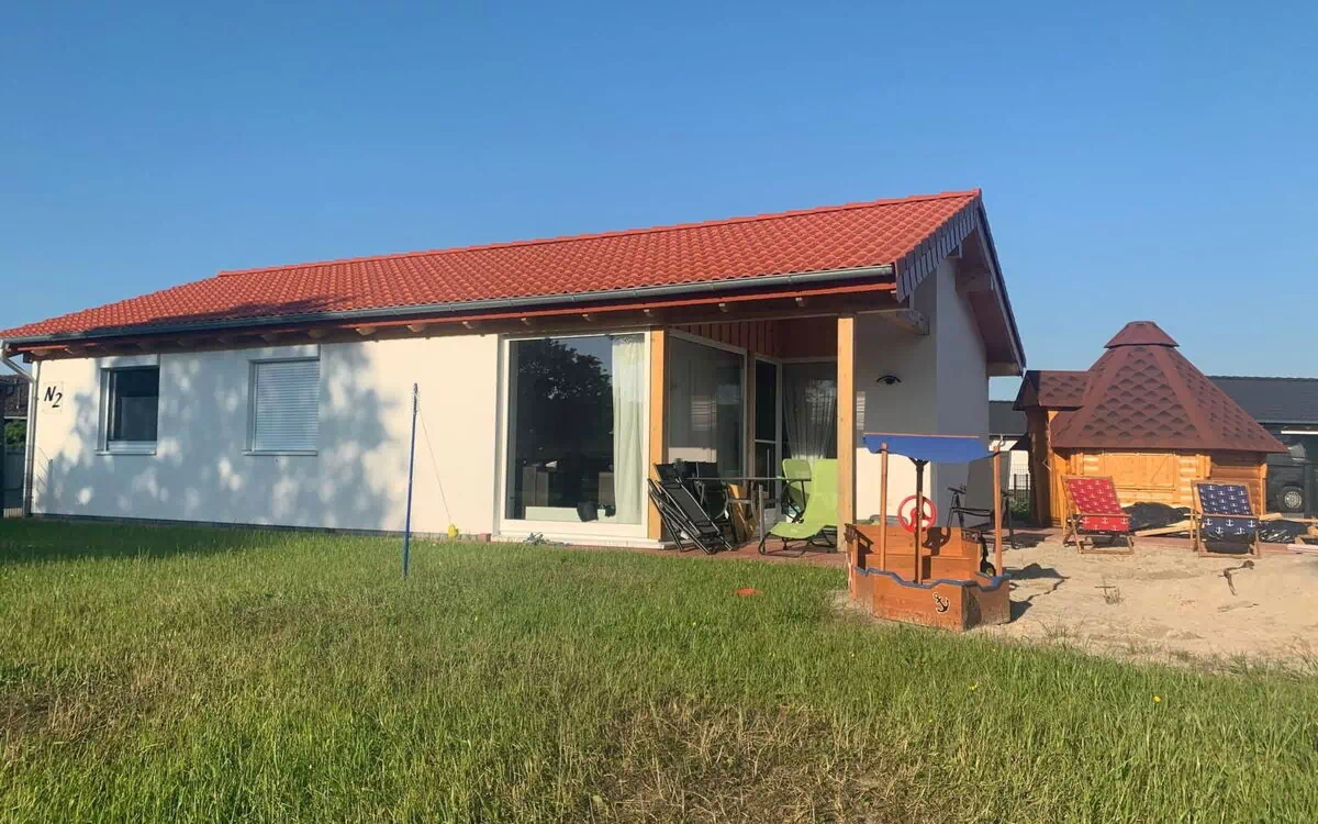 New build!!! Detached, ground floor bungalow (built June 2020) for 6 people, own approx. 740 sqm plot, sauna, completely tiled throughout the house, all windows have fly screens, walk-in shower, 2 bedrooms with TV. 3 bedrooms: 1 bedroom with double bed 180 x 200, 1 bedroom with 2 x single bed 90 x 200, 1 bedroom with 1x bunk bed, 1x single bed 90 x 200, large living room with 6.5 m window front to the floor, bathroom with walk-in shower, bathroom with flat shower tray, covered sun terrace with garden furniture and parasol, carport and further parking space behind, fully equipped fitted kitchen with dishwasher, microwave, oven and ceramic hob. Washing machine, free WLAN in the house!