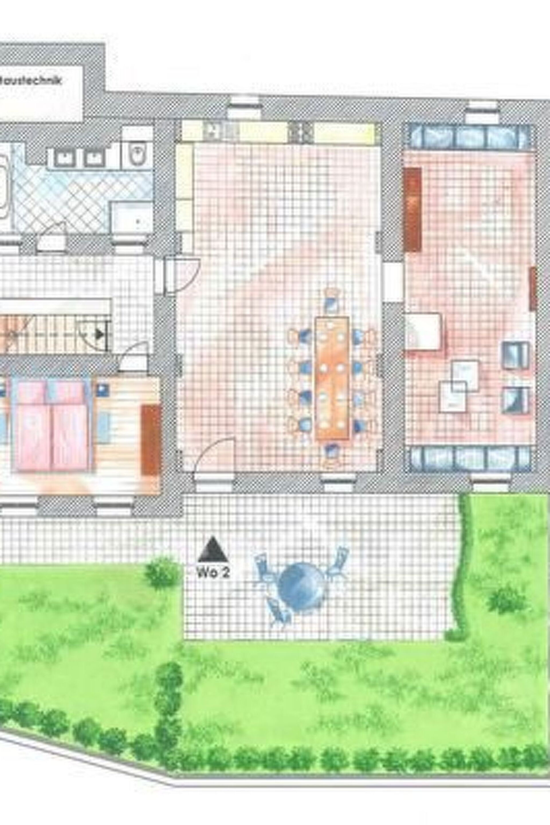 The ground floor is a large living room with fireplace and a dining room for 12 people. A modern fitted kitchen was built in the former stables.