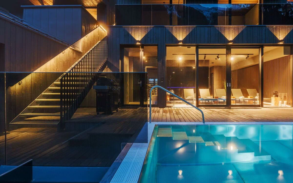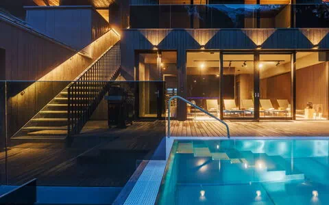 There are three double bedrooms on the ground floor, all with en-suite bathrooms. All individually designed bedrooms have large windows with direct access to private terraces, while the in-chalet wellness facilities with a Finnish and herbal sauna allow you to immerse yourself in total relaxation in the Paznaun villas. The heated outdoor infinity pool with spectacular mountain views is a foretaste of what awaits guests.