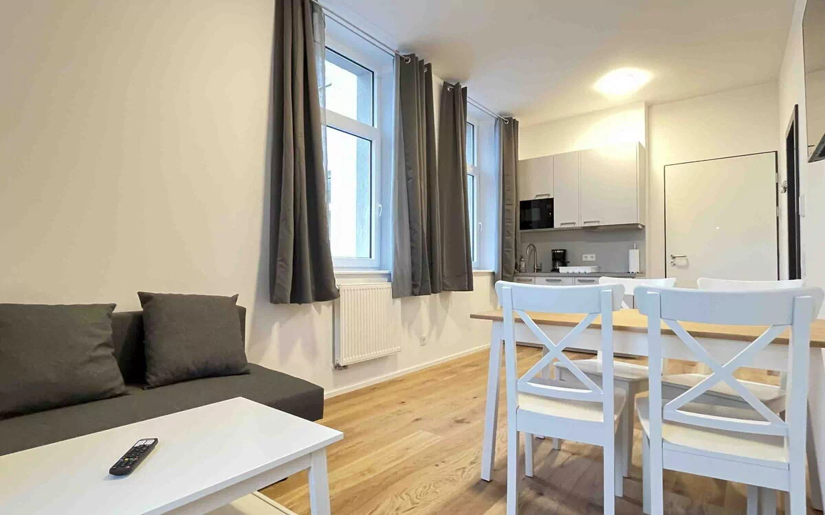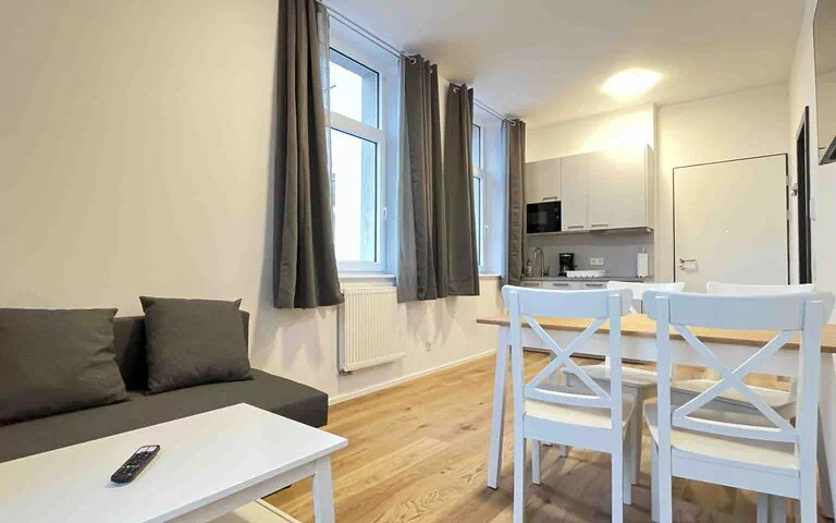 The furnished 33 m² upper floor in Amberg includes a bedroom with 2 single beds and is suitable for up to 2 people. It is possible for a third person to sleep on the sofa.