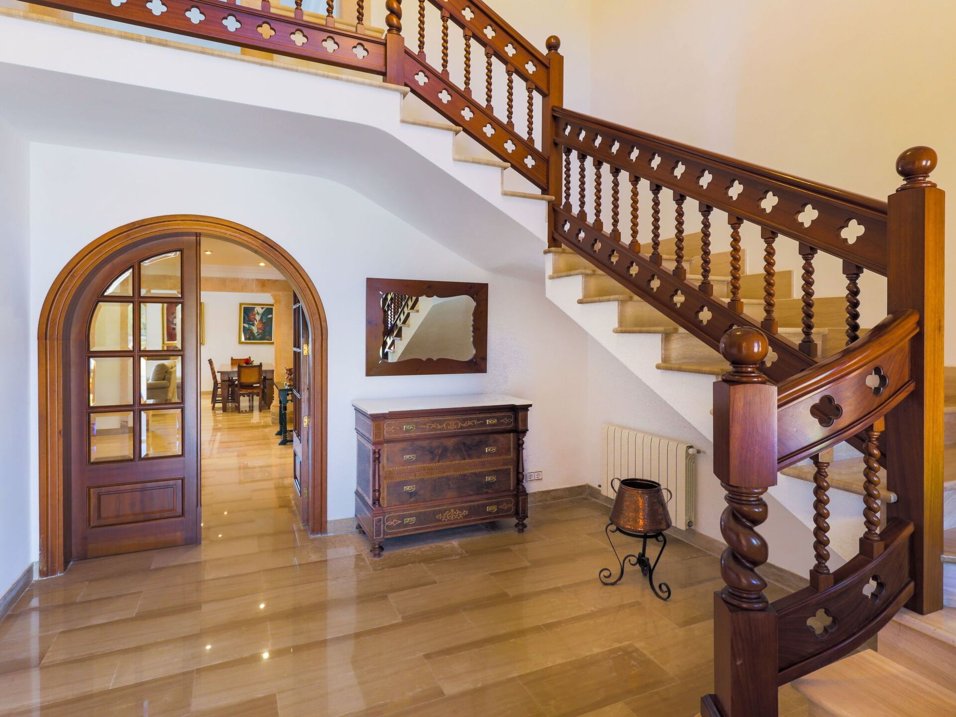 Sivina Sanau is a spacious family villa with an elegant classic style. Marble tiles give the house a pleasantly cool ambience in summer. The large entrance hall leads to an open-plan living and dining area with cosy sofas. Patio doors lead to the garden and the furnished terrace overlooking the pool. The kitchen is well equipped and is separated from the dining area by a breakfast bar. There is a washing machine in the adjoining utility room. One double bedroom and one with two single beds are located on the ground floor and share a large family bathroom with a raised round bath and shower. A further shower room with toilet can be accessed from the outside. A stately staircase with a long suspended chandelier leads to a further living room with views over the garden and pool to the tennis court. Patio doors lead to a sun terrace; ideal for private sunbathing. The master bedroom with double bed has a dressing area. Two further beautiful bedrooms, each with two single beds, have wonderful views over the countryside. On the upper floor there is a bathroom with marble tiles and a round bathtub, and tennis fans have a private tennis court at their disposal. The floodlights are not in operation.