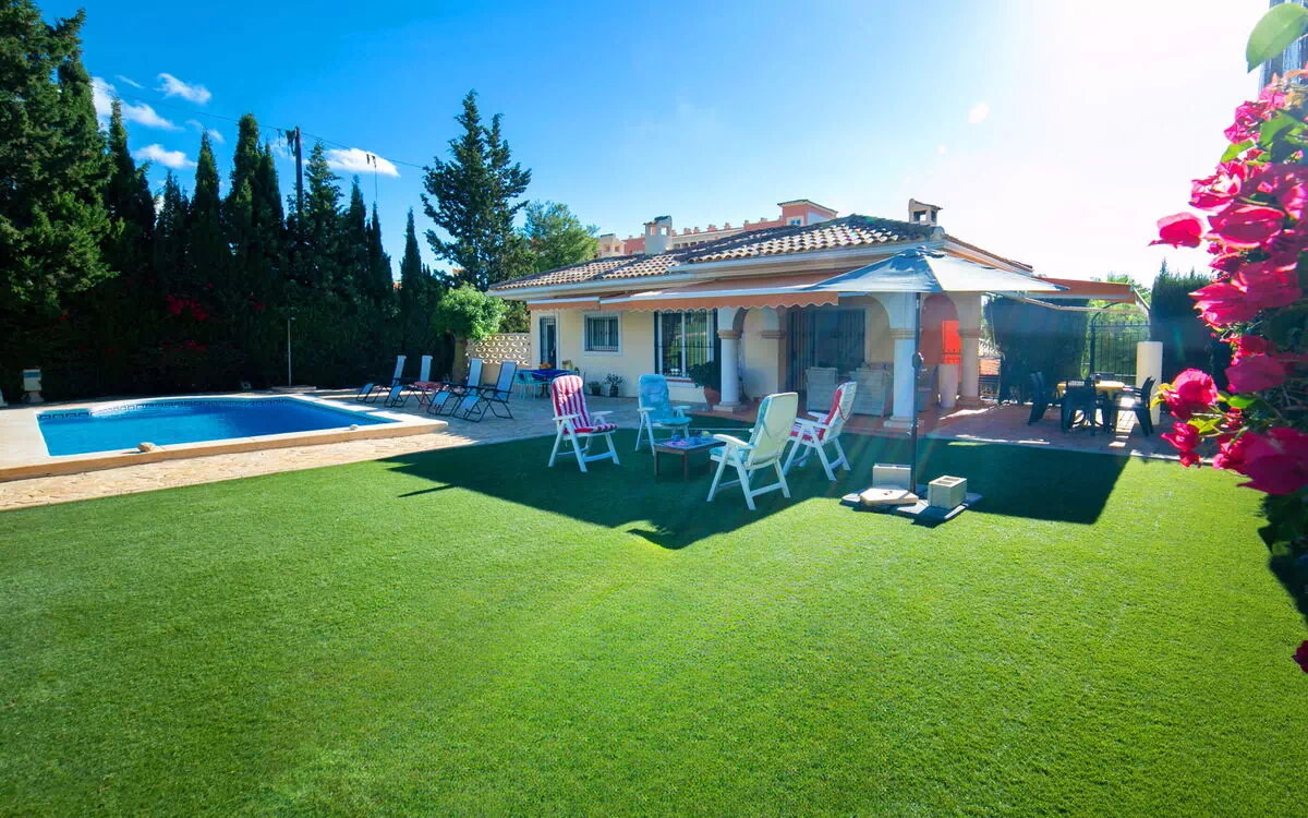 Campo de Golf Bonalba: Stor, moderne, komfortabelt resort "Bonalba Golf, Urb Los Naranjos", på 2 etager. Ved bykanten, 5 km fra centrum af San Juan-Campello, i distriktet Bonalba Golf, rolig, solrige beliggenhed, 5 km fra havet, 5 km fra stranden, på golfbanen. Til medbenyttelse: grund (indhegnet), stor have med græsplæne 35 m2, pool (4 x 7 m, 110 - 190 cm dyb, Sæsonbestemt tilgængelighed: 01.Jun. og 30.Sep.). Tennis (ekstra). Til alene benyttelse: smuk have 450 m2 (indhegnet), pool (Sæsonbestemt tilgængelighed: 01.Jan. - 31.Dec.). Udendørs brus, terrasse, pergola, havemøbler, grill. I anlægget: restaurant, bar, trådløs LAN [WLAN], spa-område (alt ekstra), indkøbsmulighed. Parkeringsplads ved huset. Indkøbsforretning, fødevarebutik, restaurant 300 m, busstoppested 300 m, banegård "Alicante" 10 km, sandstrand "San Juan/El Campello" 5 km. Lystbådhavn 10 km, golfbane (18 hul), tennis 100 m. Nærliggende attraktioner: Terra Mitica 38 km, Terra Natura 38 km, Aqualandia 38 km, Alicante 19 km, Benidorm Palace 38 km, Aeropuerto de Alicante 30 km. Bemærk venligst: bil anbefales. Anlægget har vagt om natten. Objoktnummer ES9749.303.1 er beliggende på samme grund.