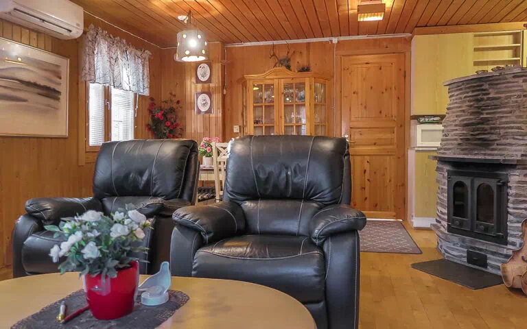 Wooden cabin, built in 1977, renovated last in 2002, living room with bunk bed (120 cm wide, separated from other room by using closets) and a sofa bed for two, a kitchenette, a sleeping alcove (entrance through porch) with 1 bed (120 cm), sauna (electric stove), shower, separate toilet, entrance hall, open porch.