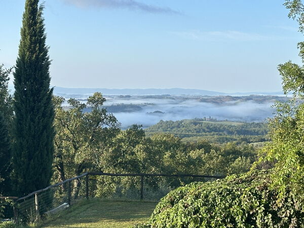 the views from the villa are stunning especially the sun setting on Montepoluciano with the ever-changing light you never get tired of looking over the hills the kitchen is nicely equipped with everything you need We even had a cooking class at the villla that was great fun we spent most of the time outside wes aroundr the picnic table with a very solid Covering over it.
