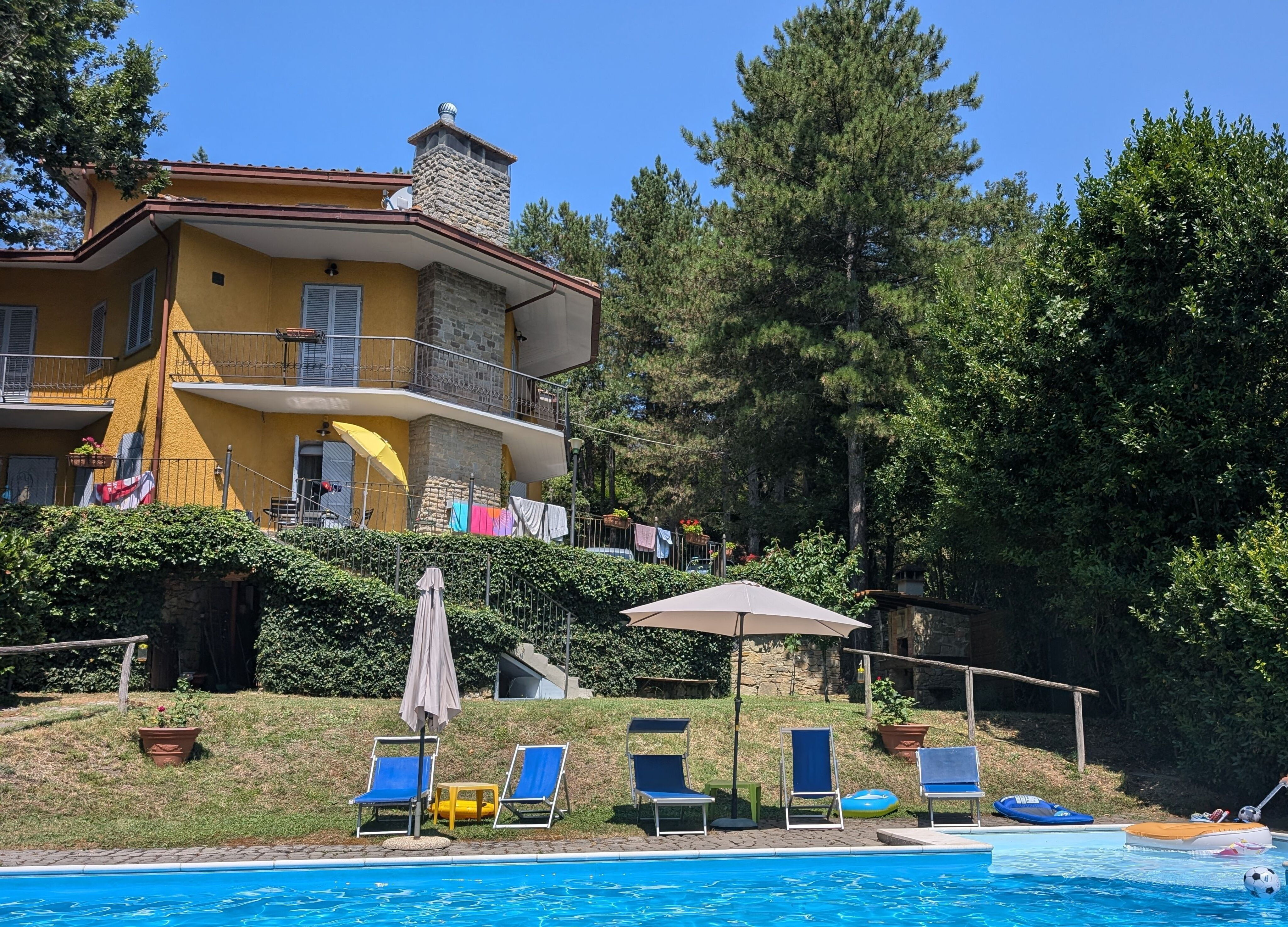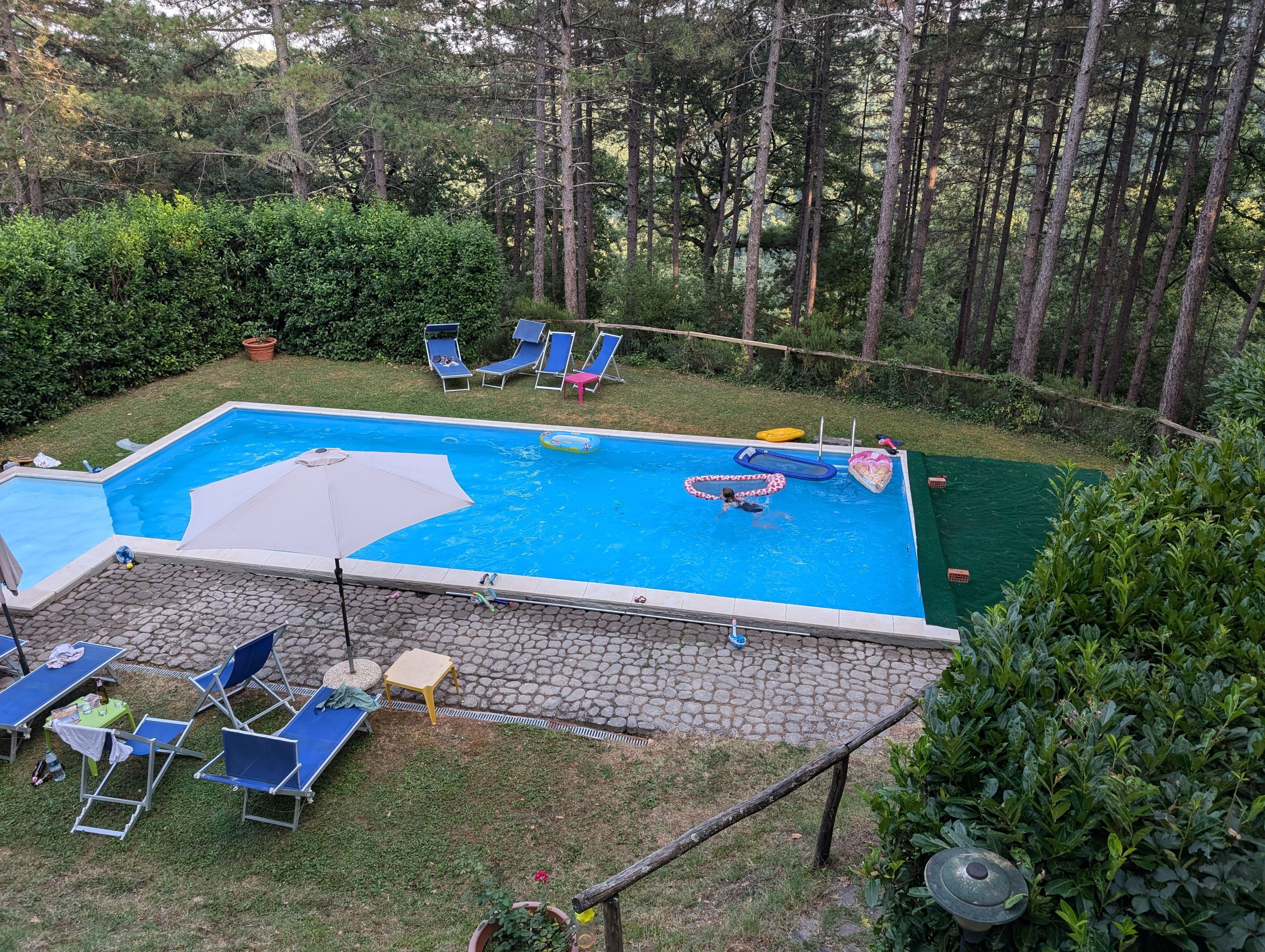 [English translation courtesy of Easy Reserve] We had a wonderful time at Villa Marisa in the summer of 2024. The house is located in a small village on a pass. Even in midsummer, the temperatures here are more pleasant than in the nearby towns. The pool is large and well maintained. Our children in particular had a lot of fun swimming in it. The furnishings leave nothing to be desired: On the ground floor there is a small kitchen (with dishwasher!) and a lovely large dining room. Around the house there are further seating areas, barbecues, a pizza oven and even a small playground. The bedrooms are clean and spacious. The two bathrooms are small, but clean and functional. There is a washing machine in a small extra room that can be reached from the outside.